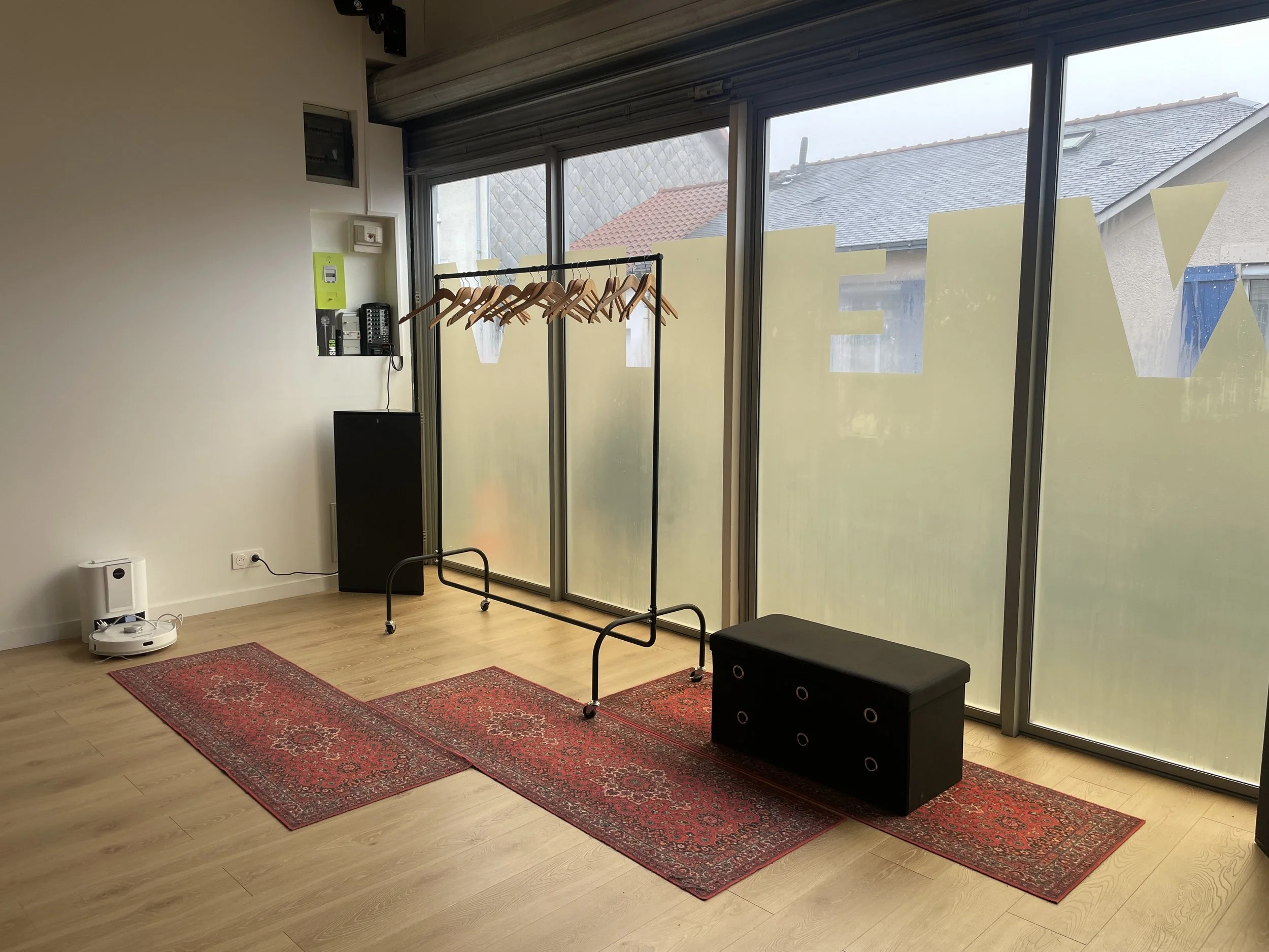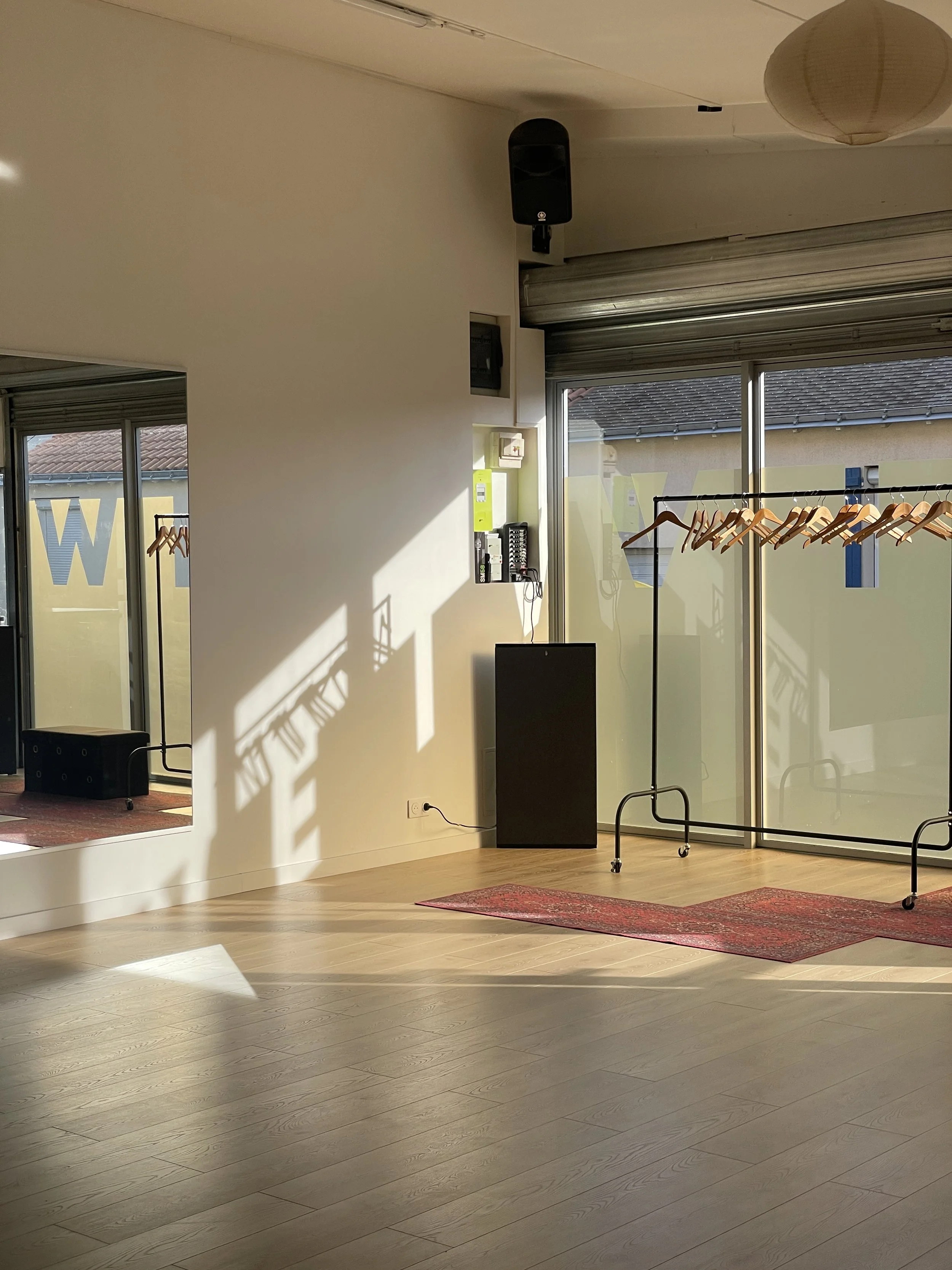 Le Petit Studio d'une surface de 40m2, composé d'un miroir, d'un système son et un accès WC. Il se transforme également en espace de 80m2 (uniquement lors des événements).